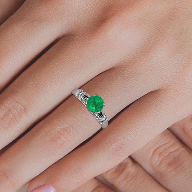 A mesmerizing round Emerald shines at the heart of this vintage-inspired masterpiece, framed by 56 lab grown diamonds, delicate milgrain accents, and a graceful split shank.