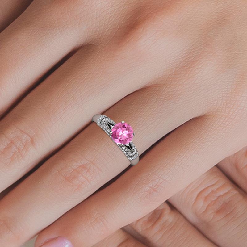 A mesmerizing round Pink Sapphire shines at the heart of this vintage-inspired masterpiece, framed by 56 lab grown diamonds, delicate milgrain accents, and a graceful split shank.