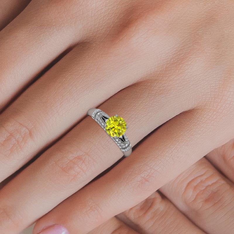 A mesmerizing round Yellow Diamond shines at the heart of this vintage-inspired masterpiece, framed by 56 lab grown diamonds, delicate milgrain accents, and a graceful split shank.