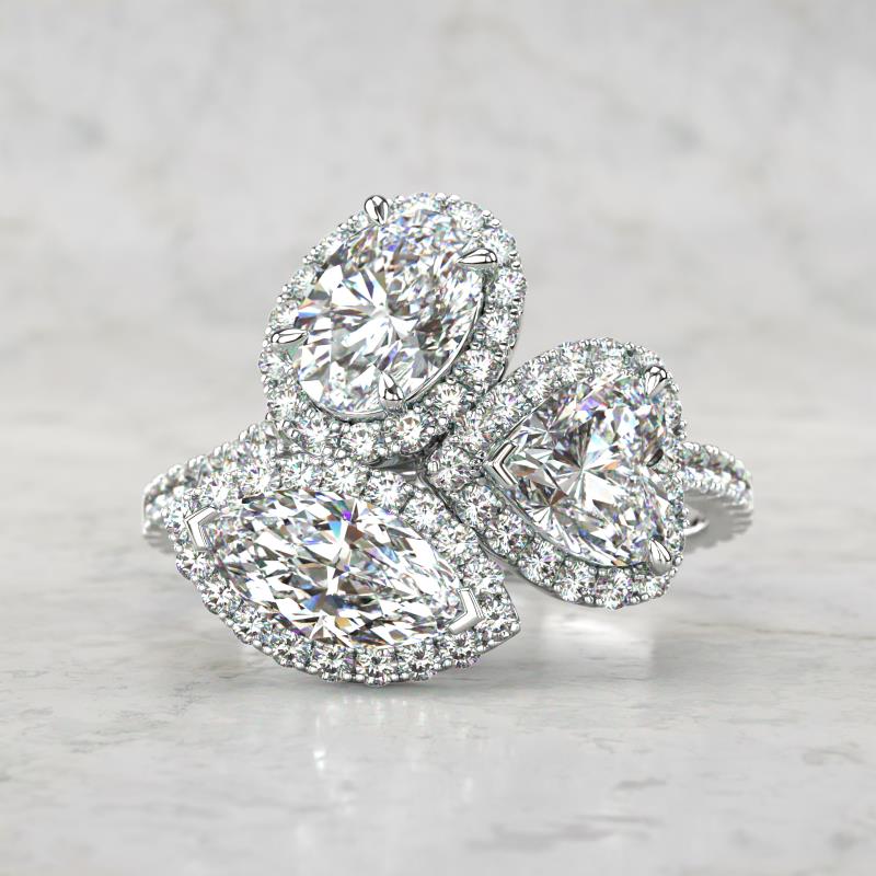 This multi-shape IGI Certified Lab Grown Diamond Three Stone Engagement ring of 3.27 ctw features a unique design that is sure to catch the eye. The ring accommodates an oval, heart, & marquise shape Lab Grown Diamonds. The brilliant round Natural Diamonds pave-set on the band beautifully complement the center Lab Grown Diamonds, adding a dazzling sparkle and extra dimension to the ring.