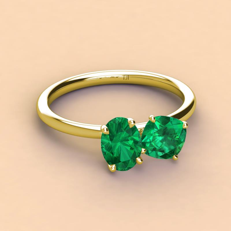 Two-stone Duo ring featuring an Oval & Cushion Shape Emerald crafted beautifully that will effortlessly blend with her casual outfits and evening dresses.