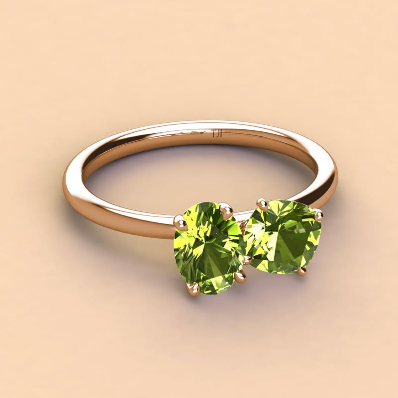 Two-stone Duo ring featuring an Oval & Cushion shape Peridot crafted beautifully that will effortlessly blend with her casual outfits and evening dresses.