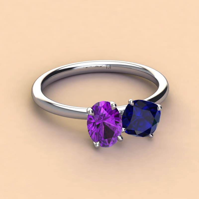 Two-stone Duo ring featuring an Oval shape Amethyst and Cushion shape Blue Sapphire crafted beautifully that will effortlessly blend with her casual outfits and evening dresses.