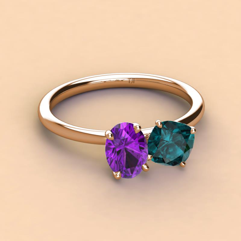 Two-stone Duo ring featuring an Oval shape Amethyst and Cushion shape London Blue Topaz crafted beautifully that will effortlessly blend with her casual outfits and evening dresses.