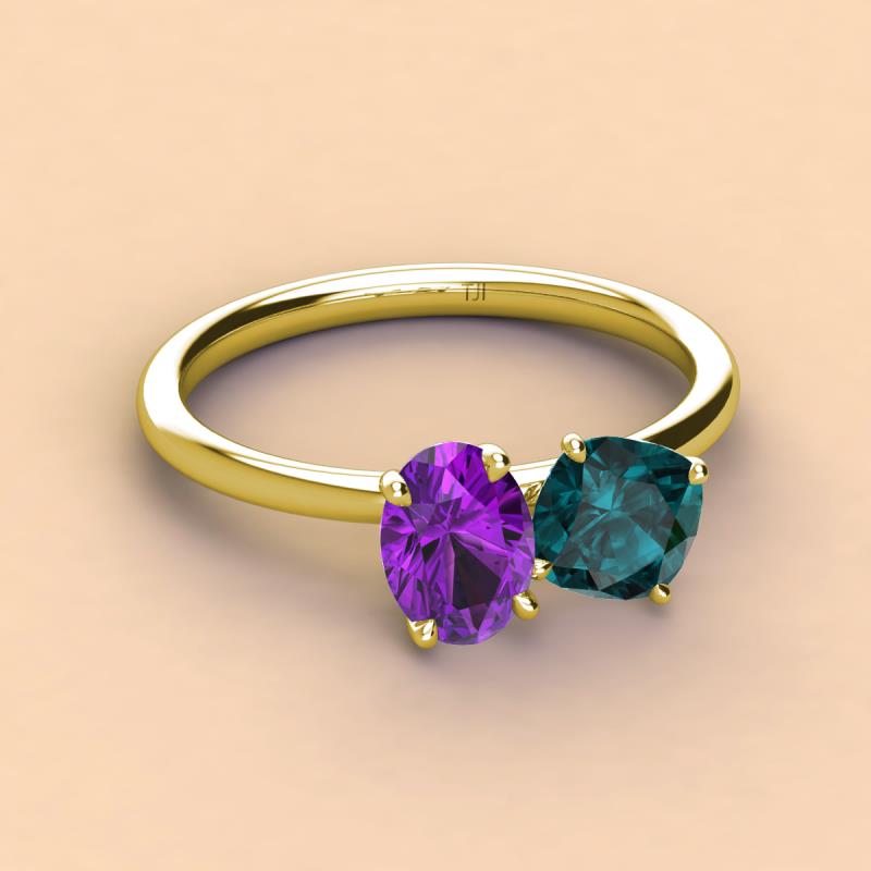 Two-stone Duo ring featuring an Oval shape Amethyst and Cushion shape London Blue Topaz crafted beautifully that will effortlessly blend with her casual outfits and evening dresses.