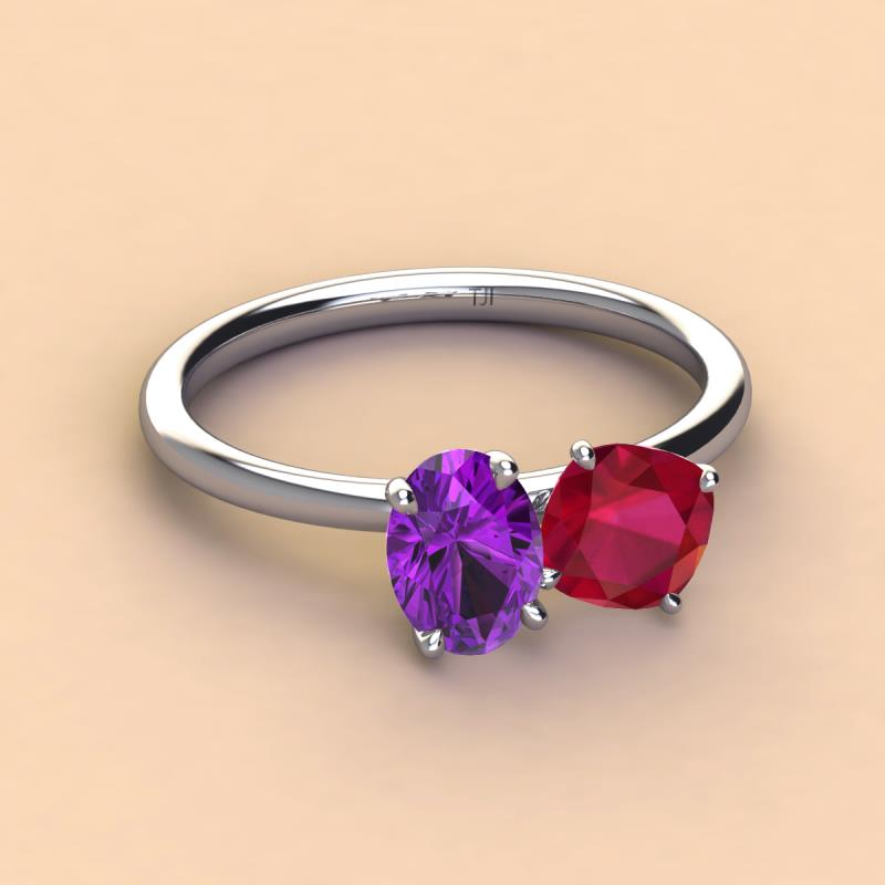 Two-stone Duo ring featuring an Oval shape Amethyst and Cushion shape Ruby crafted beautifully that will effortlessly blend with her casual outfits and evening dresses.