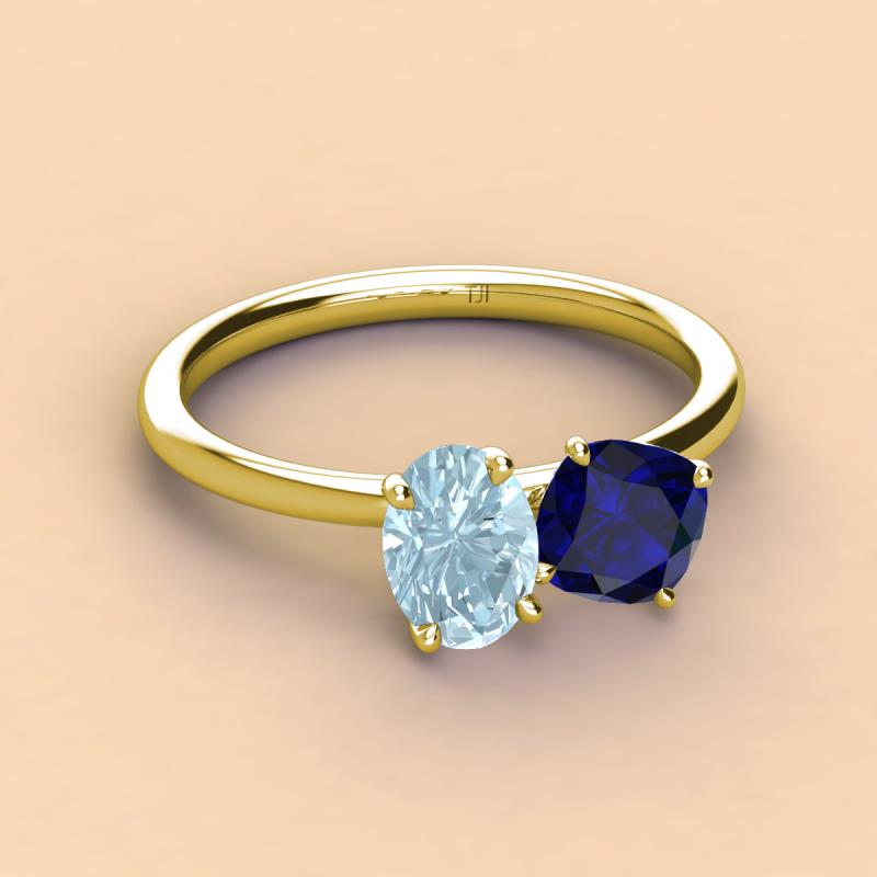 Two-stone Duo ring featuring an Oval shape Aquamarine and Cushion shape Blue Sapphire crafted beautifully that will effortlessly blend with her casual outfits and evening dresses.