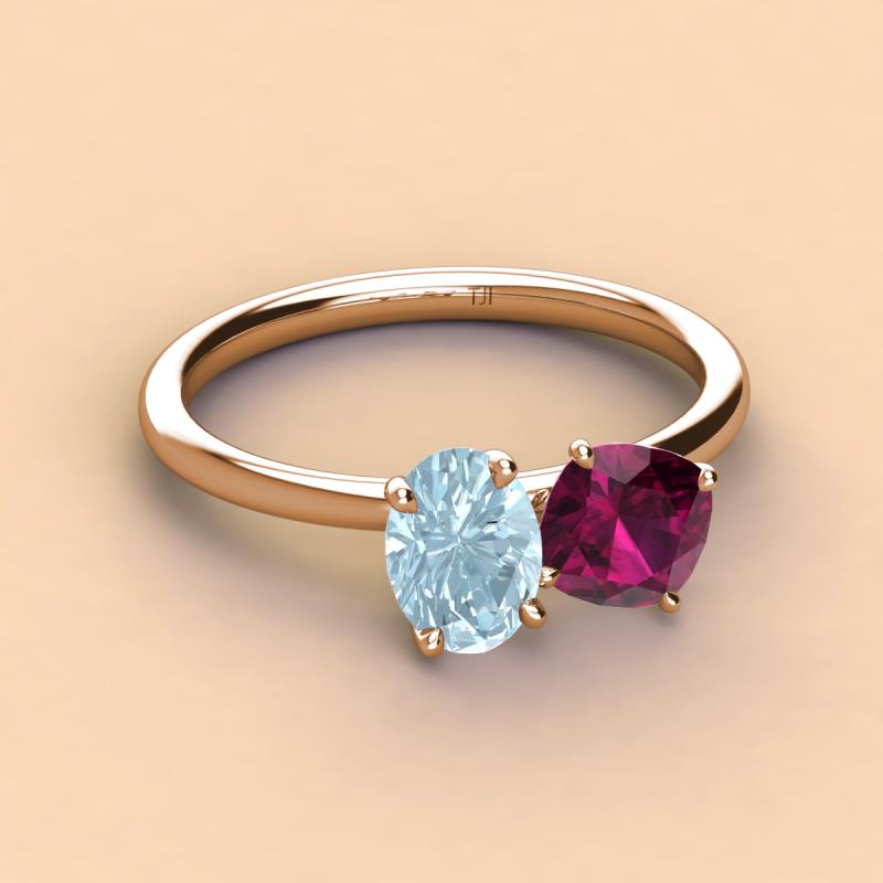 Two-stone Duo ring featuring an Oval shape Aquamarine and Cushion shape Rhodolite Garnet crafted beautifully that will effortlessly blend with her casual outfits and evening dresses.