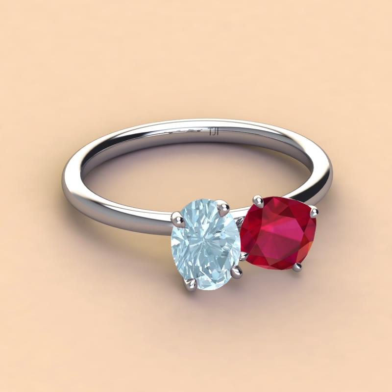 Two-stone Duo ring featuring an Oval shape Aquamarine and Cushion shape Ruby crafted beautifully that will effortlessly blend with her casual outfits and evening dresses.