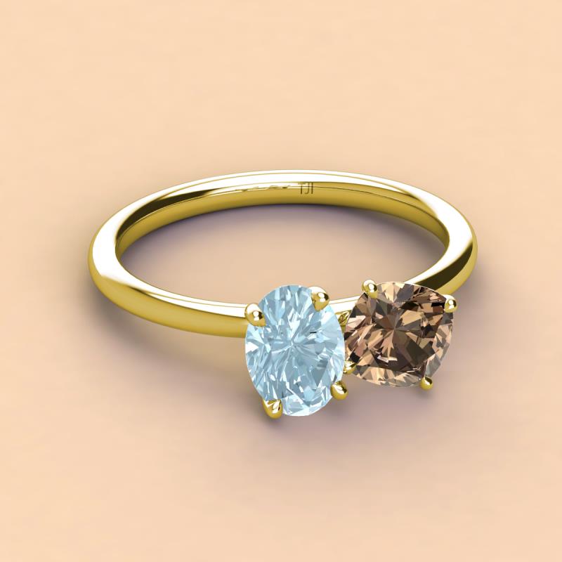 Two-stone Duo ring featuring an Oval shape Aquamarine and Cushion shape Smoky Quartz crafted beautifully that will effortlessly blend with her casual outfits and evening dresses.