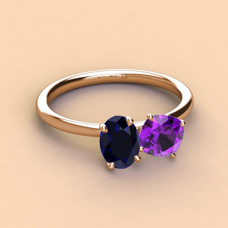 Two-stone Duo ring featuring an Oval shape Blue Sapphire and Cushion shape Amethyst crafted beautifully that will effortlessly blend with her casual outfits and evening dresses.