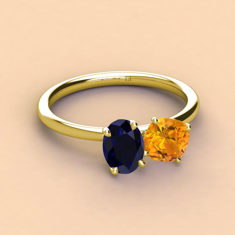 Two-stone Duo ring featuring an Oval shape Blue Sapphire and Cushion shape Citrine crafted beautifully that will effortlessly blend with her casual outfits and evening dresses.