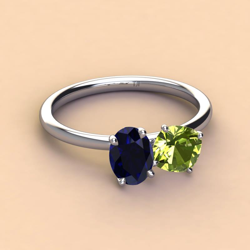Two-stone Duo ring featuring an Oval shape Blue Sapphire and Cushion shape Peridot crafted beautifully that will effortlessly blend with her casual outfits and evening dresses.