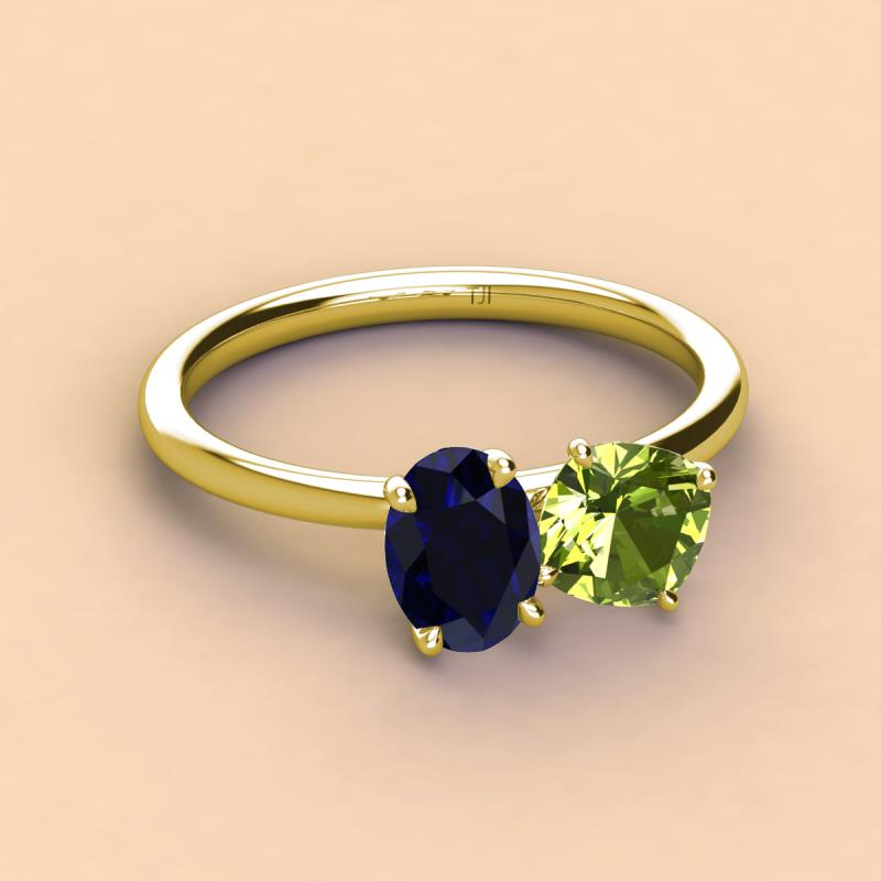 Two-stone Duo ring featuring an Oval shape Blue Sapphire and Cushion shape Peridot crafted beautifully that will effortlessly blend with her casual outfits and evening dresses.