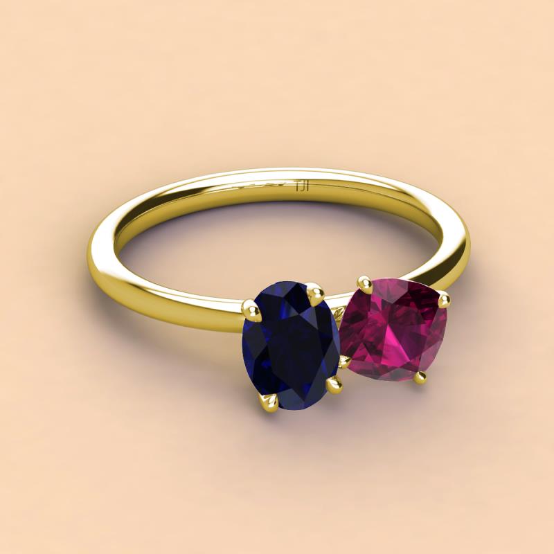 Two-stone Duo ring featuring an Oval shape Blue Sapphire and Cushion shape Rhodolite Garnet crafted beautifully that will effortlessly blend with her casual outfits and evening dresses.