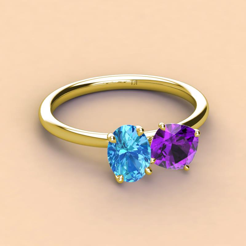 Two-stone Duo ring featuring an Oval shape Blue Topaz and Cushion shape Amethyst crafted beautifully that will effortlessly blend with her casual outfits and evening dresses.