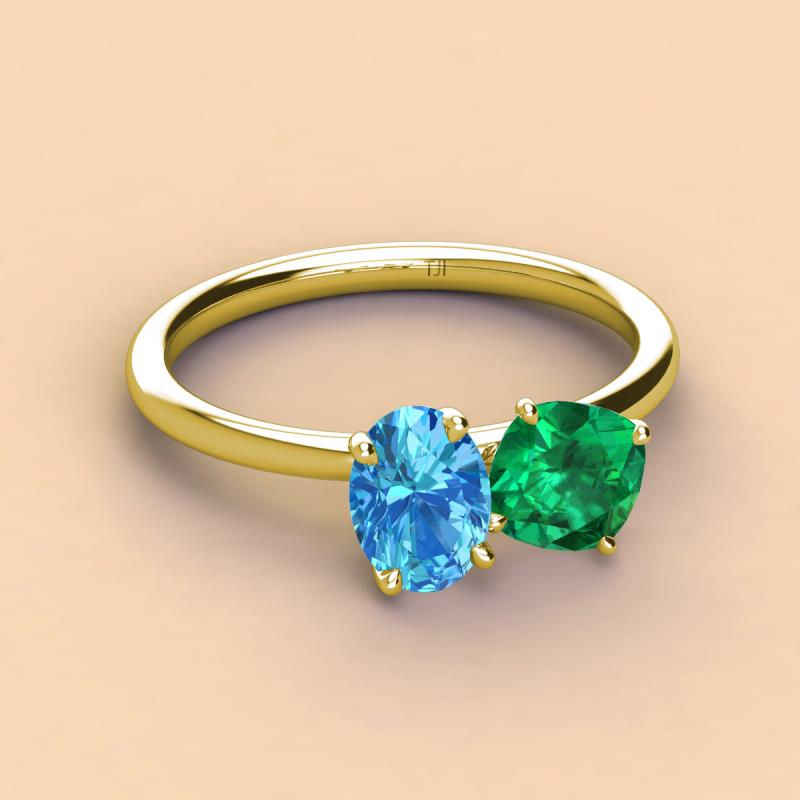 Two-stone Duo ring featuring an Oval shape Blue Topaz and Cushion Shape Emerald crafted beautifully that will effortlessly blend with her casual outfits and evening dresses.