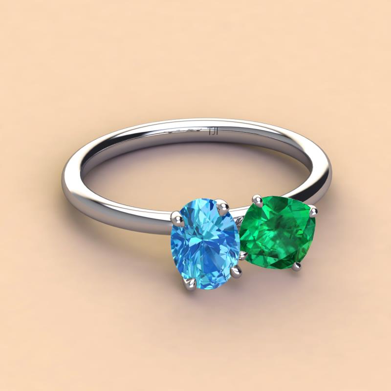 Two-stone Duo ring featuring an Oval shape Blue Topaz and Cushion Shape Emerald crafted beautifully that will effortlessly blend with her casual outfits and evening dresses.
