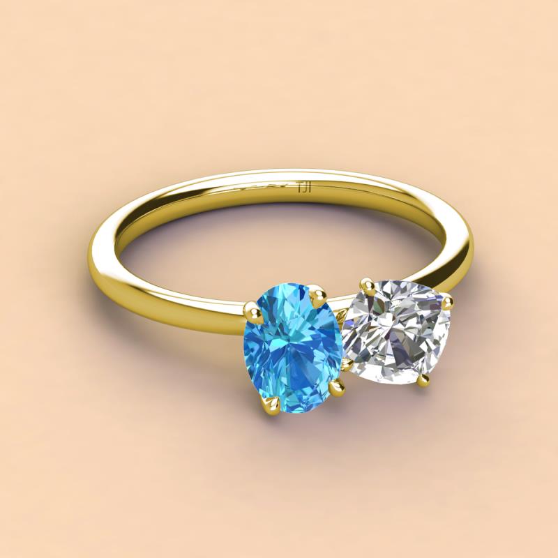 Two-stone Duo ring featuring an Oval shape Blue Topaz and Cushion shape Forever One Moissanite crafted beautifully that will effortlessly blend with her casual outfits and evening dresses.