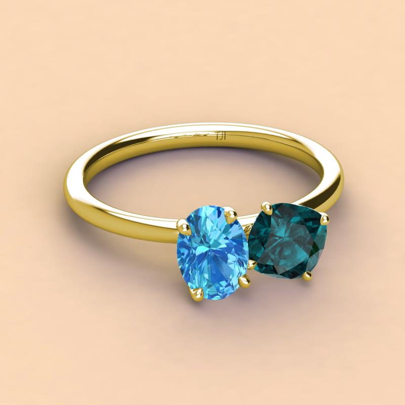 Two-stone Duo ring featuring an Oval shape Blue Topaz and Cushion shape London Blue Topaz crafted beautifully that will effortlessly blend with her casual outfits and evening dresses.