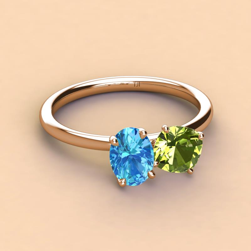 Two-stone Duo ring featuring an Oval shape Blue Topaz and Cushion shape Peridot crafted beautifully that will effortlessly blend with her casual outfits and evening dresses.