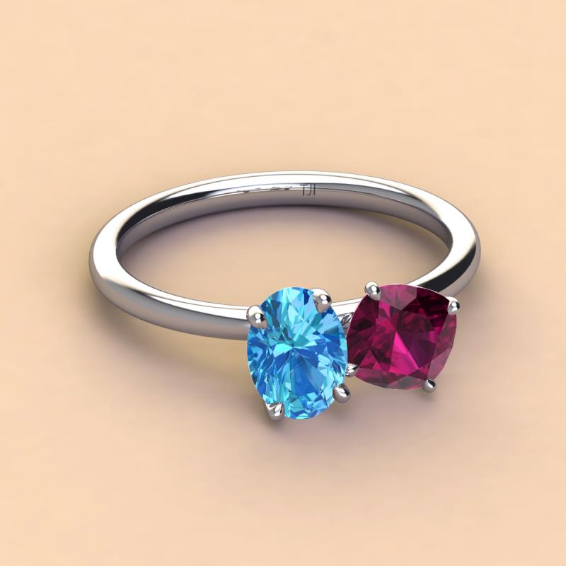 Two-stone Duo ring featuring an Oval shape Blue Topaz and Cushion shape Rhodolite Garnet crafted beautifully that will effortlessly blend with her casual outfits and evening dresses.