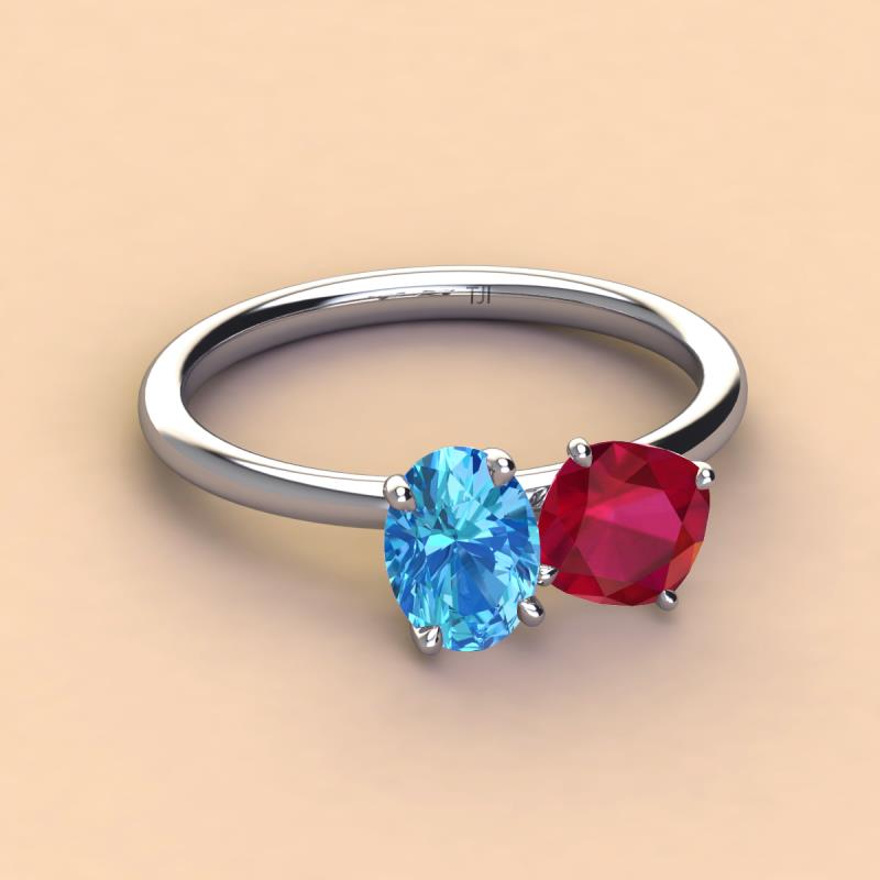 Two-stone Duo ring featuring an Oval shape Blue Topaz and Cushion Shape Ruby crafted beautifully that will effortlessly blend with her casual outfits and evening dresses.