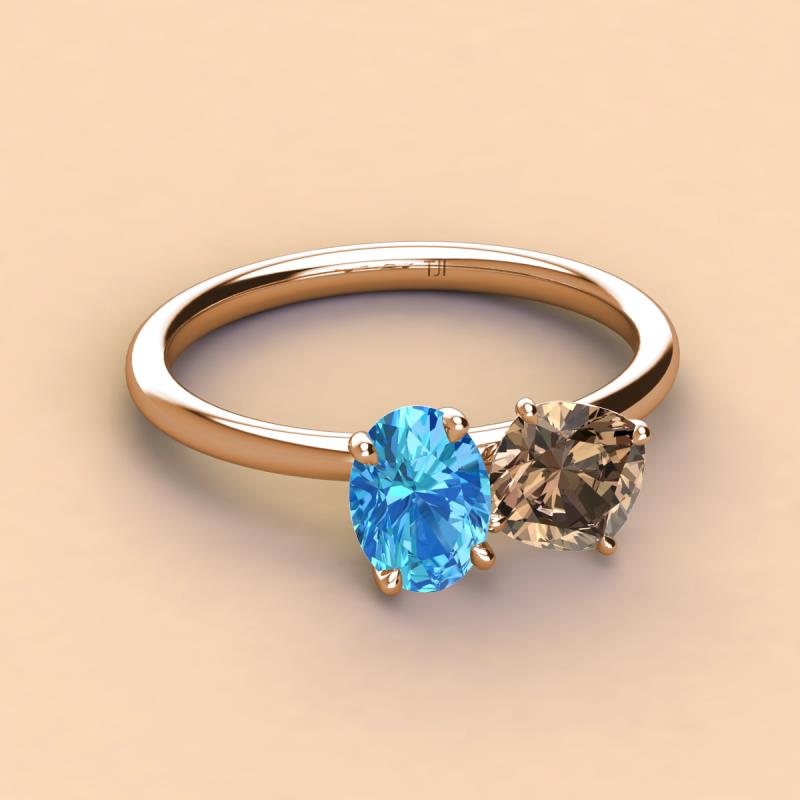 Two-stone Duo ring featuring an Oval shape Blue Topaz and Cushion shape Smoky Quartz crafted beautifully that will effortlessly blend with her casual outfits and evening dresses.