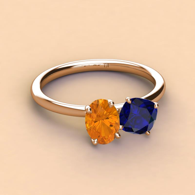 Two-stone Duo ring featuring an Oval shape Citrine and Cushion Shape Blue Sapphire crafted beautifully that will effortlessly blend with her casual outfits and evening dresses.