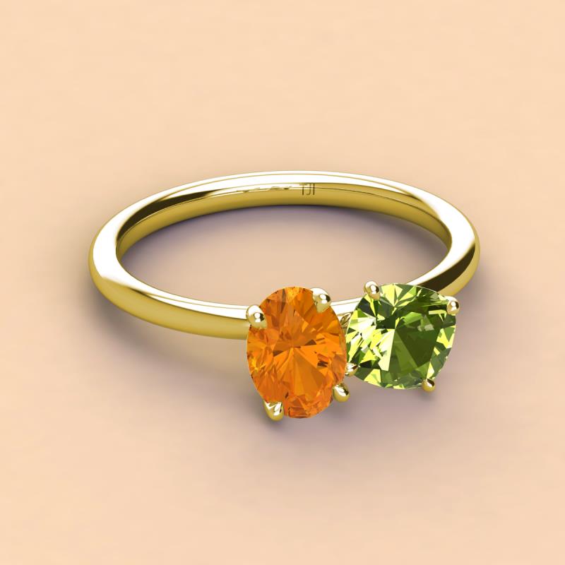 Two-stone Duo ring featuring an Oval shape Citrine and Cushion shape Peridot crafted beautifully that will effortlessly blend with her casual outfits and evening dresses.