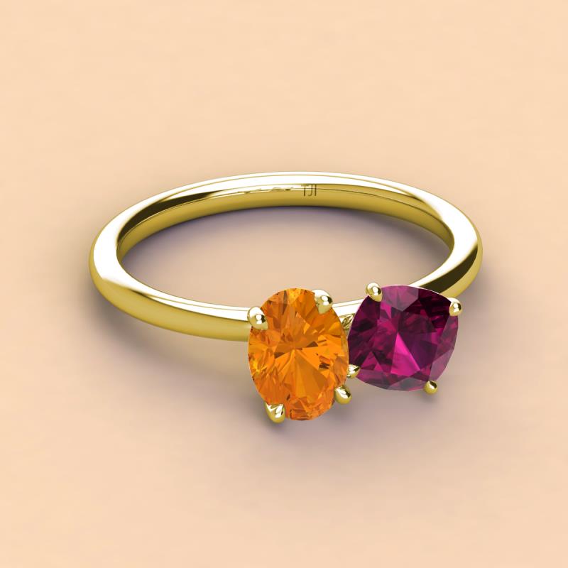 Two-stone Duo ring featuring an Oval shape Citrine and Cushion shape Rhodolite Garnet crafted beautifully that will effortlessly blend with her casual outfits and evening dresses.