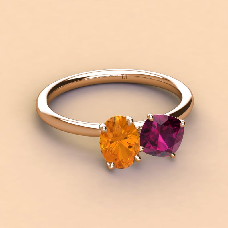 Two-stone Duo ring featuring an Oval shape Citrine and Cushion shape Rhodolite Garnet crafted beautifully that will effortlessly blend with her casual outfits and evening dresses.