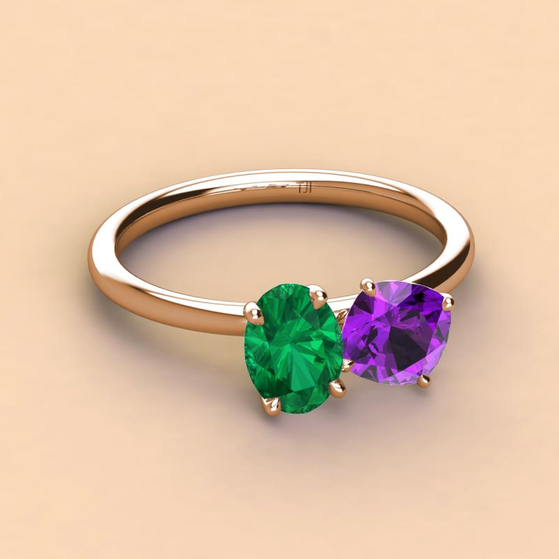 Two-stone Duo ring featuring an Oval shape Emerald and Cushion shape Amethyst crafted beautifully that will effortlessly blend with her casual outfits and evening dresses.