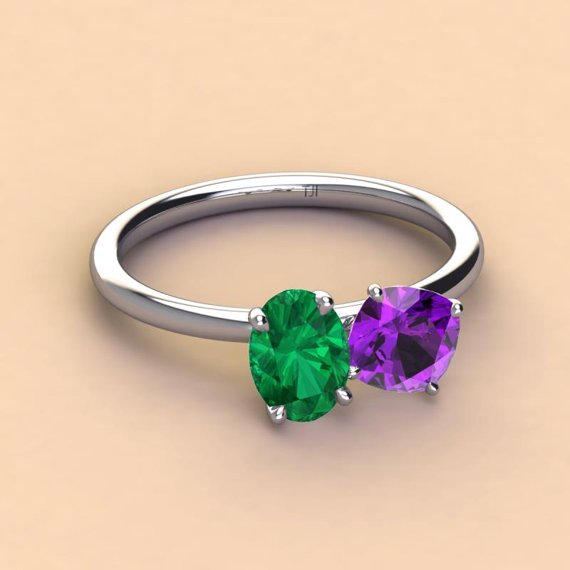 Two-stone Duo ring featuring an Oval shape Emerald and Cushion shape Amethyst crafted beautifully that will effortlessly blend with her casual outfits and evening dresses.