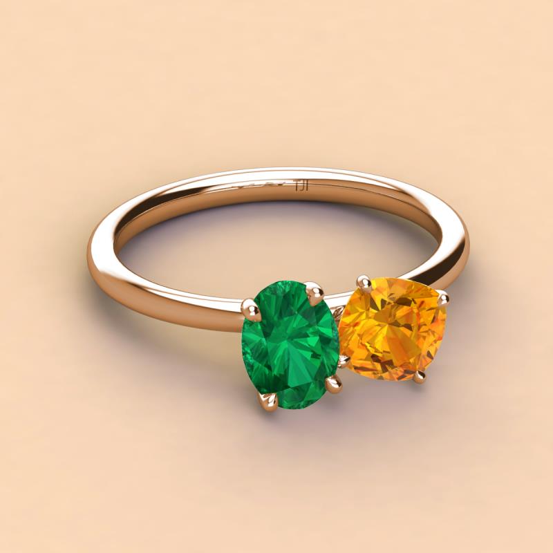 Two-stone Duo ring featuring an Oval shape Emerald and Cushion shape Citrine crafted beautifully that will effortlessly blend with her casual outfits and evening dresses.