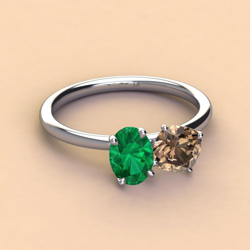 Two-stone Duo ring featuring an Oval shape Emerald and Cushion shape Smoky Quartz crafted beautifully that will effortlessly blend with her casual outfits and evening dresses.