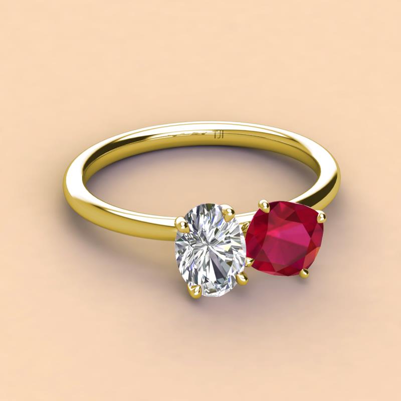 Two-stone Duo ring featuring an Oval shape Forever Brilliant Moissanite and Cushion shape Ruby crafted beautifully that will effortlessly blend with her casual outfits and evening dresses.