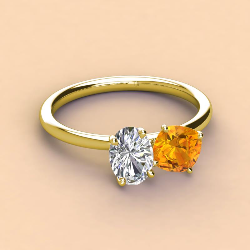 Two-stone Duo ring featuring an Oval shape Forever One Moissanite and Cushion shape Citrine crafted beautifully that will effortlessly blend with her casual outfits and evening dresses.
