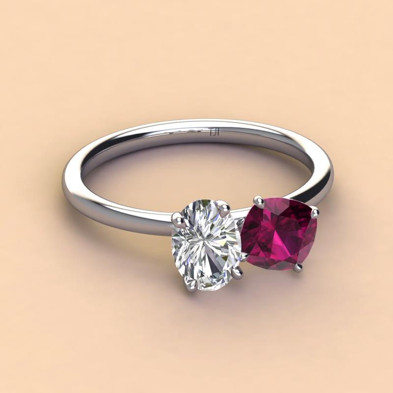 Two-stone Duo ring featuring an Oval shape Forever One Moissanite and Cushion shape Rhodolite Garnet crafted beautifully that will effortlessly blend with her casual outfits and evening dresses.