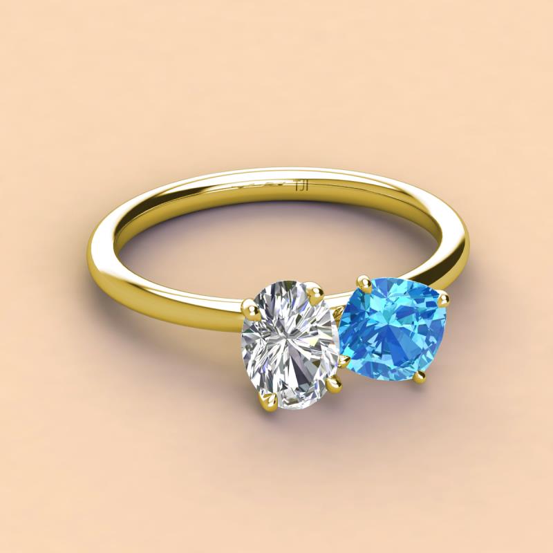Two-stone Duo ring featuring an Oval shape GIA Certified Diamond and Cushion shape Lab Blue Topaz crafted beautifully that will effortlessly blend with her casual outfits and evening dresses.