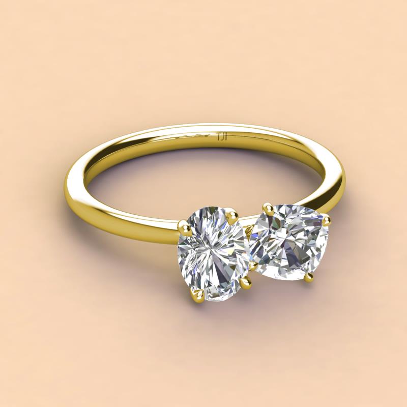 Two-stone Duo ring featuring an Oval shape GIA Certified Diamond and Cushion shape Forever One Moissanite crafted beautifully that will effortlessly blend with her casual outfits and evening dresses.