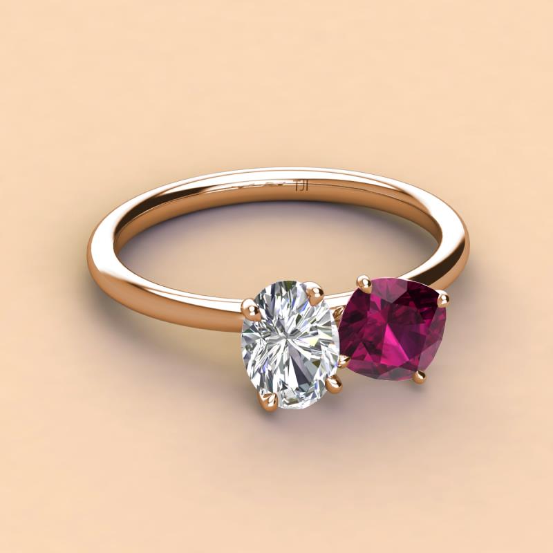 Two-stone Duo ring featuring an Oval shape GIA Certified Diamond and Cushion shape Forever One Rhodolite Garnet crafted beautifully that will effortlessly blend with her casual outfits and evening dresses.