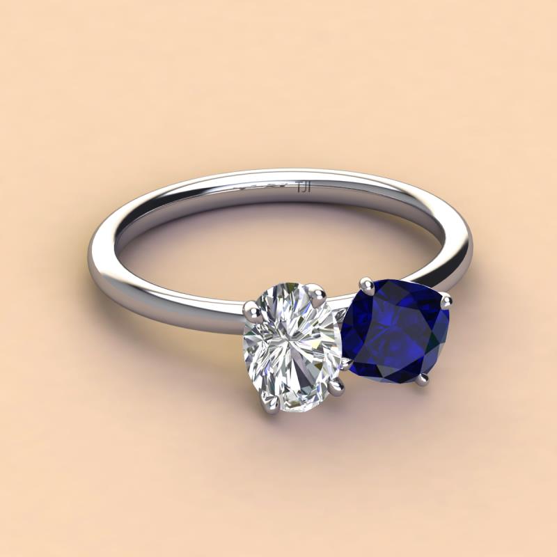 Two-stone Duo ring featuring an Oval shape IGI Certified Lab Grown Diamond and Cushion Shape Blue Sapphire crafted beautifully that will effortlessly blend with her casual outfits and evening dresses.