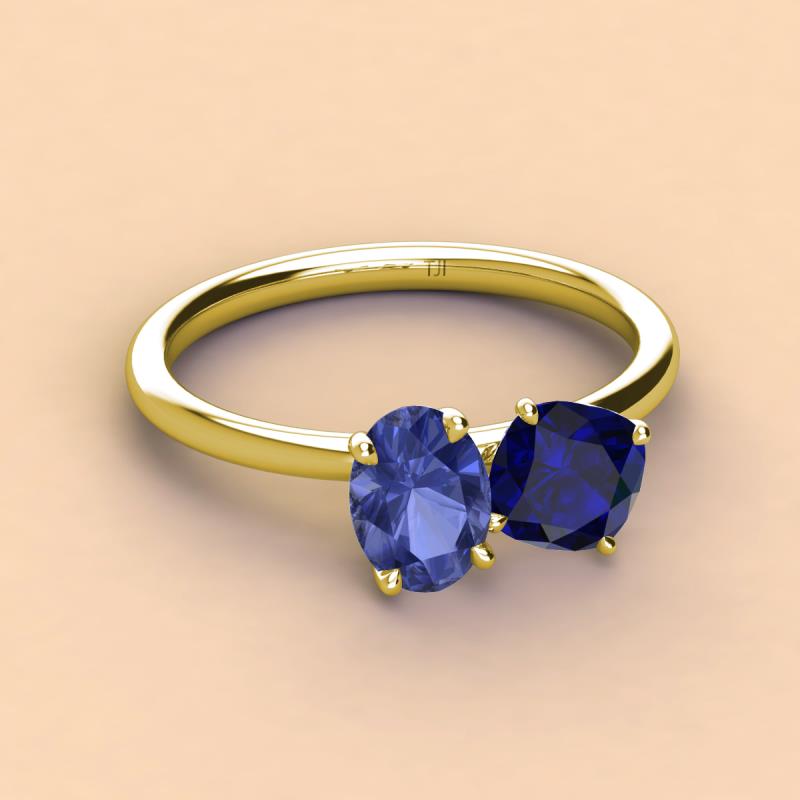 Two-stone Duo ring featuring an Oval shape Iolite and Cushion shape Blue Sapphire crafted beautifully that will effortlessly blend with her casual outfits and evening dresses.