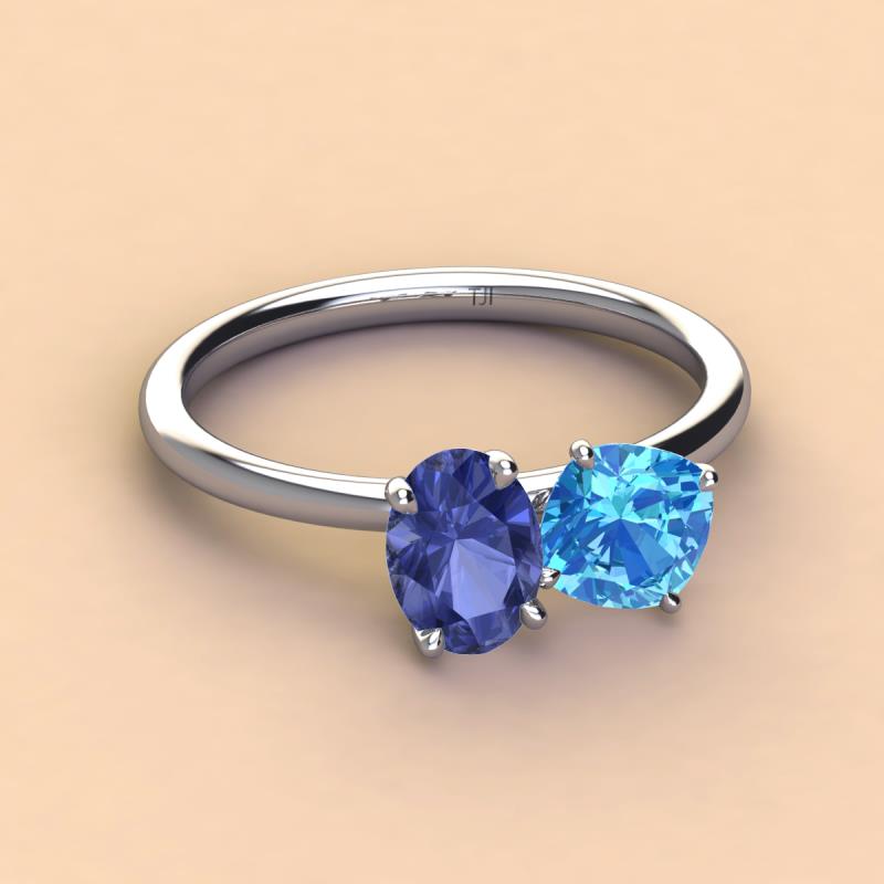 Two-stone Duo ring featuring an Oval shape Iolite and Cushion shape Blue Topaz crafted beautifully that will effortlessly blend with her casual outfits and evening dresses.