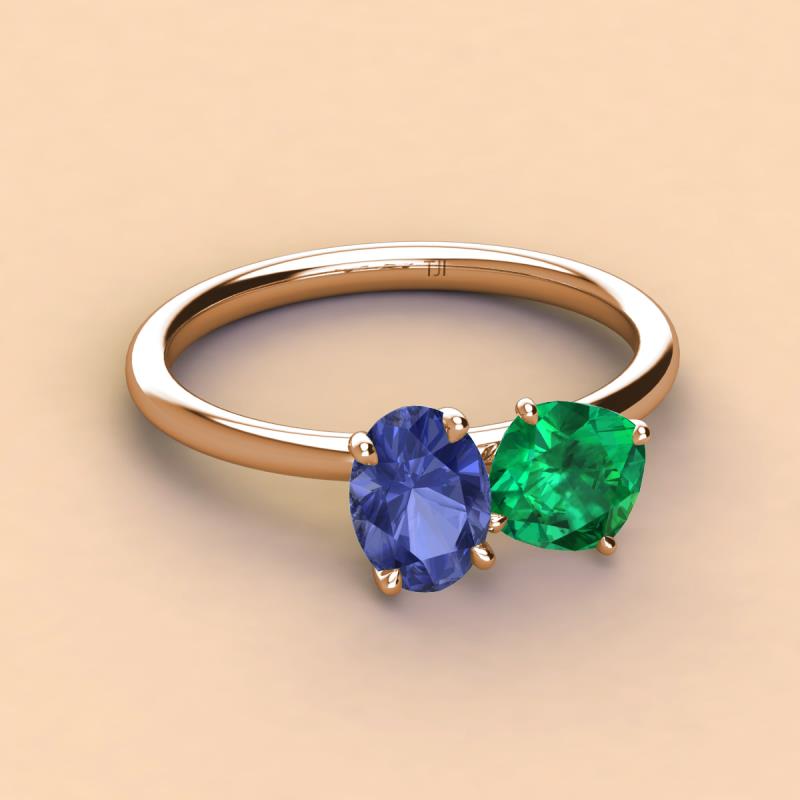 Two-stone Duo ring featuring an Oval shape Iolite and Cushion shape Emerald crafted beautifully that will effortlessly blend with her casual outfits and evening dresses.