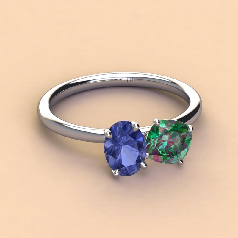 Two-stone Duo ring featuring an Oval shape Iolite and Cushion shape Lab Created Alexandrite crafted beautifully that will effortlessly blend with her casual outfits and evening dresses.