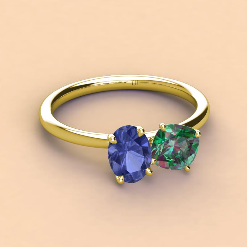 Two-stone Duo ring featuring an Oval shape Iolite and Cushion shape Lab Created Alexandrite crafted beautifully that will effortlessly blend with her casual outfits and evening dresses.