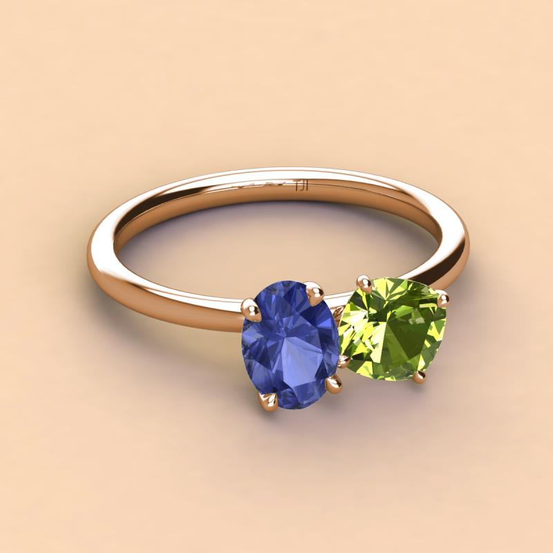 Two-stone Duo ring featuring an Oval shape Iolite and Cushion shape Peridot crafted beautifully that will effortlessly blend with her casual outfits and evening dresses.