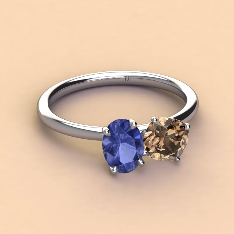 Two-stone Duo ring featuring an Oval shape Iolite and Cushion shape Smoky Quartz crafted beautifully that will effortlessly blend with her casual outfits and evening dresses.